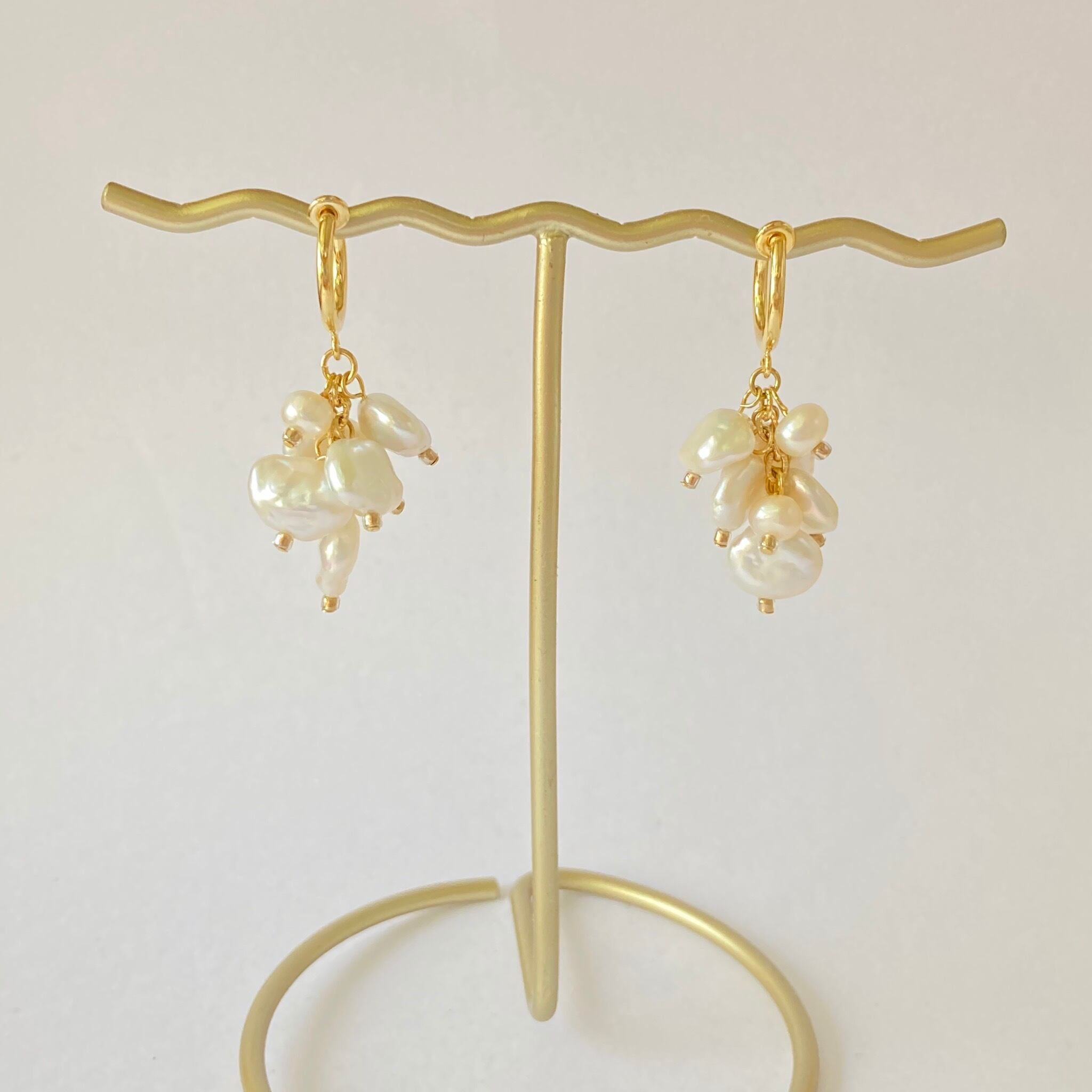 2種類の大きさの淡水パールを使用し、ボリューム感溢れる耳飾りを制作いたしました。