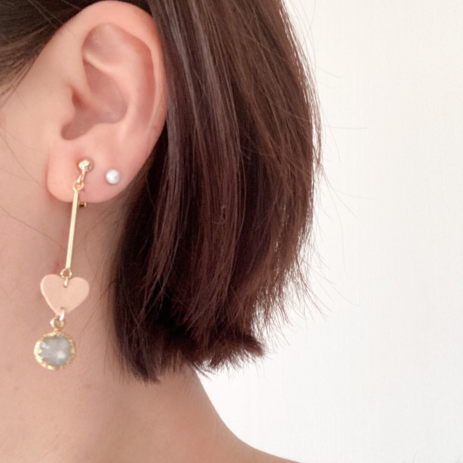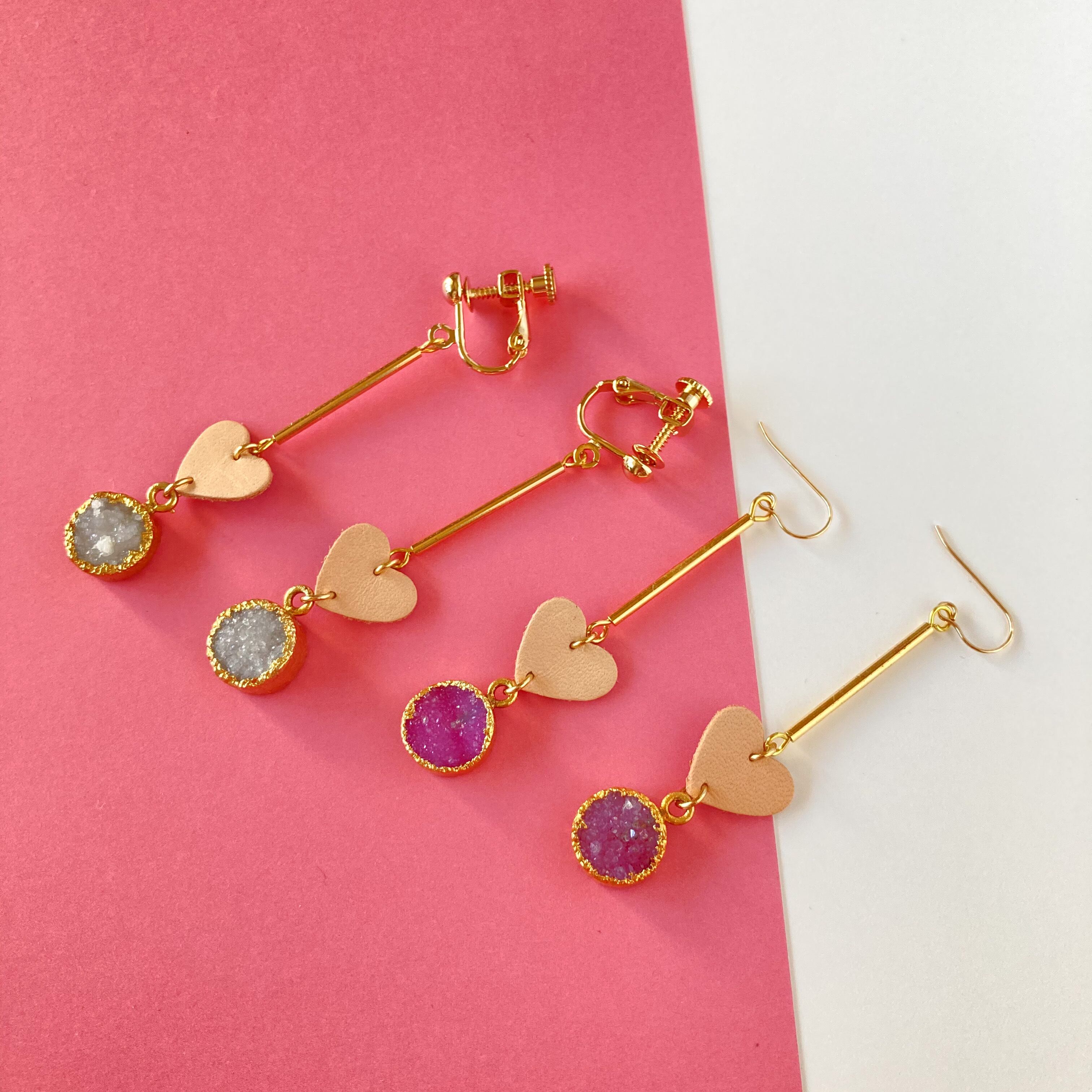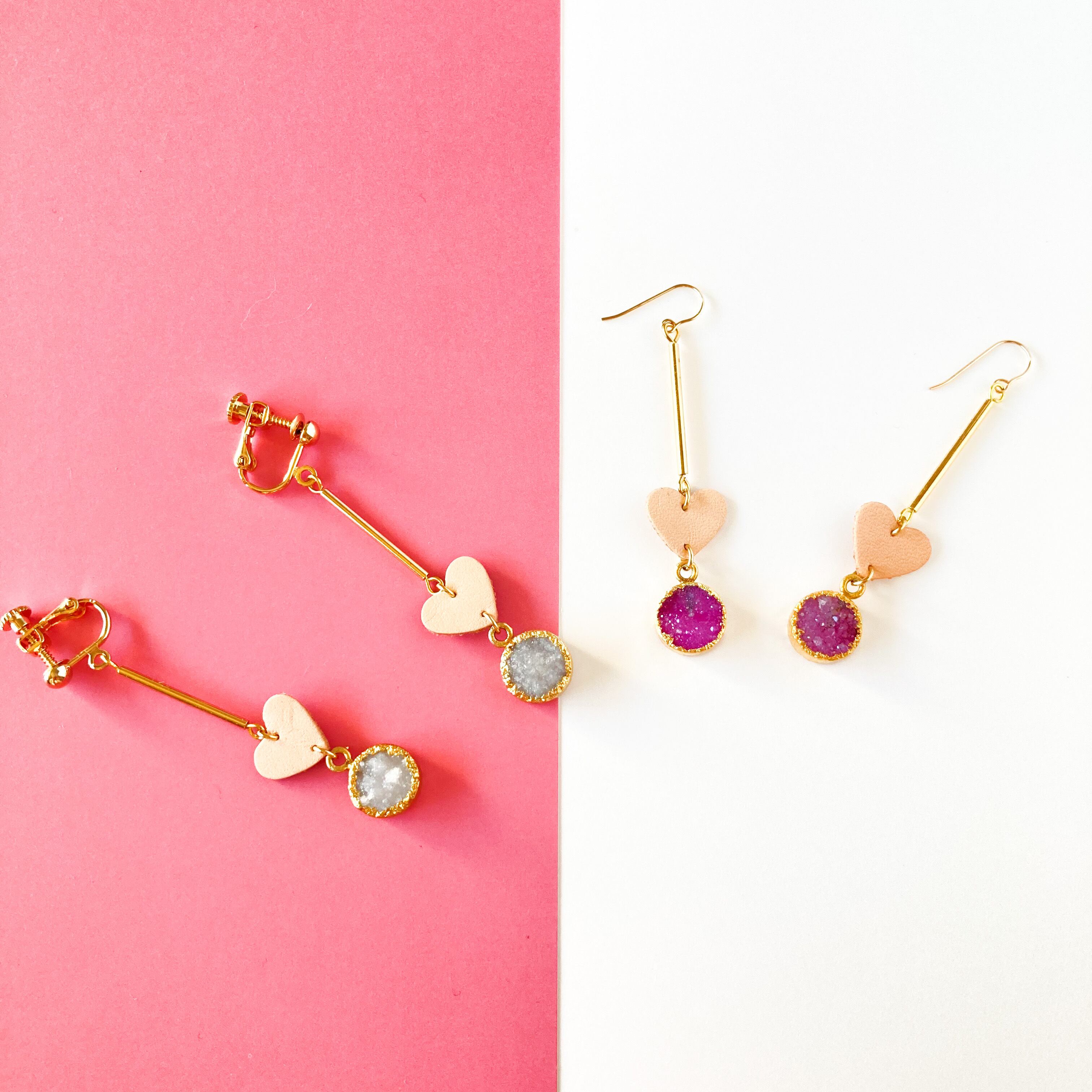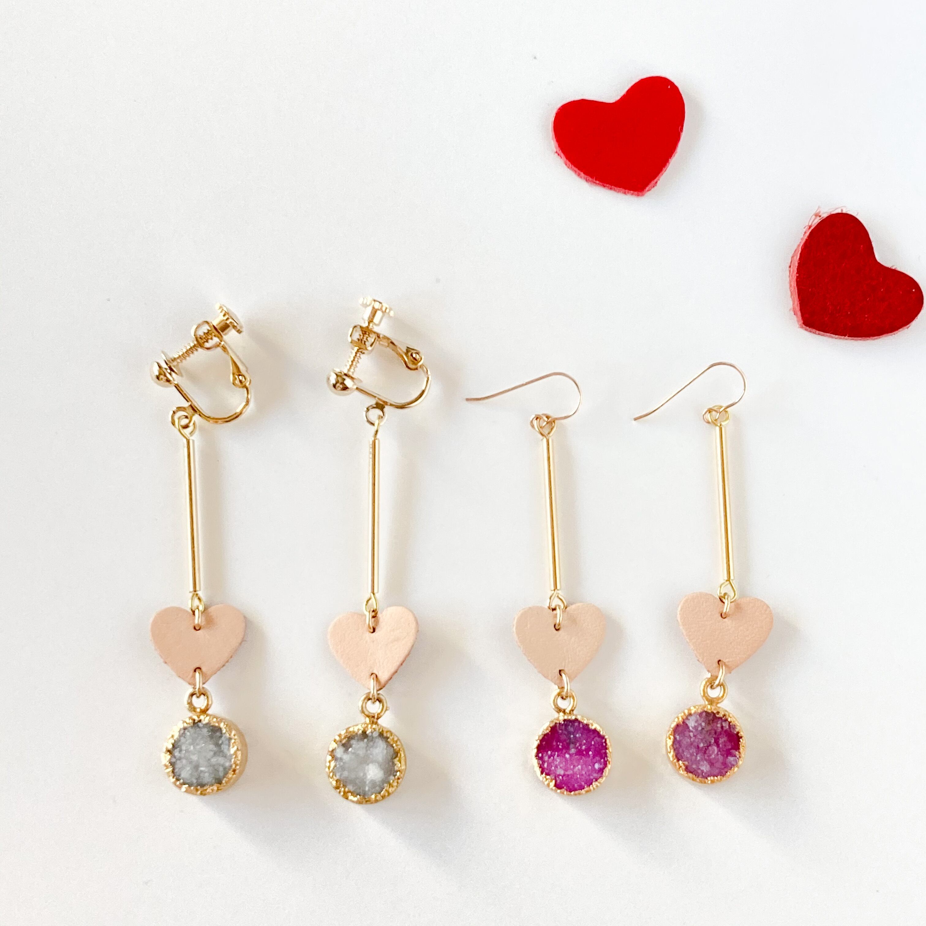 プチハートのレザーとキラキラドゥルージーを合わせて耳飾りを制作しました。