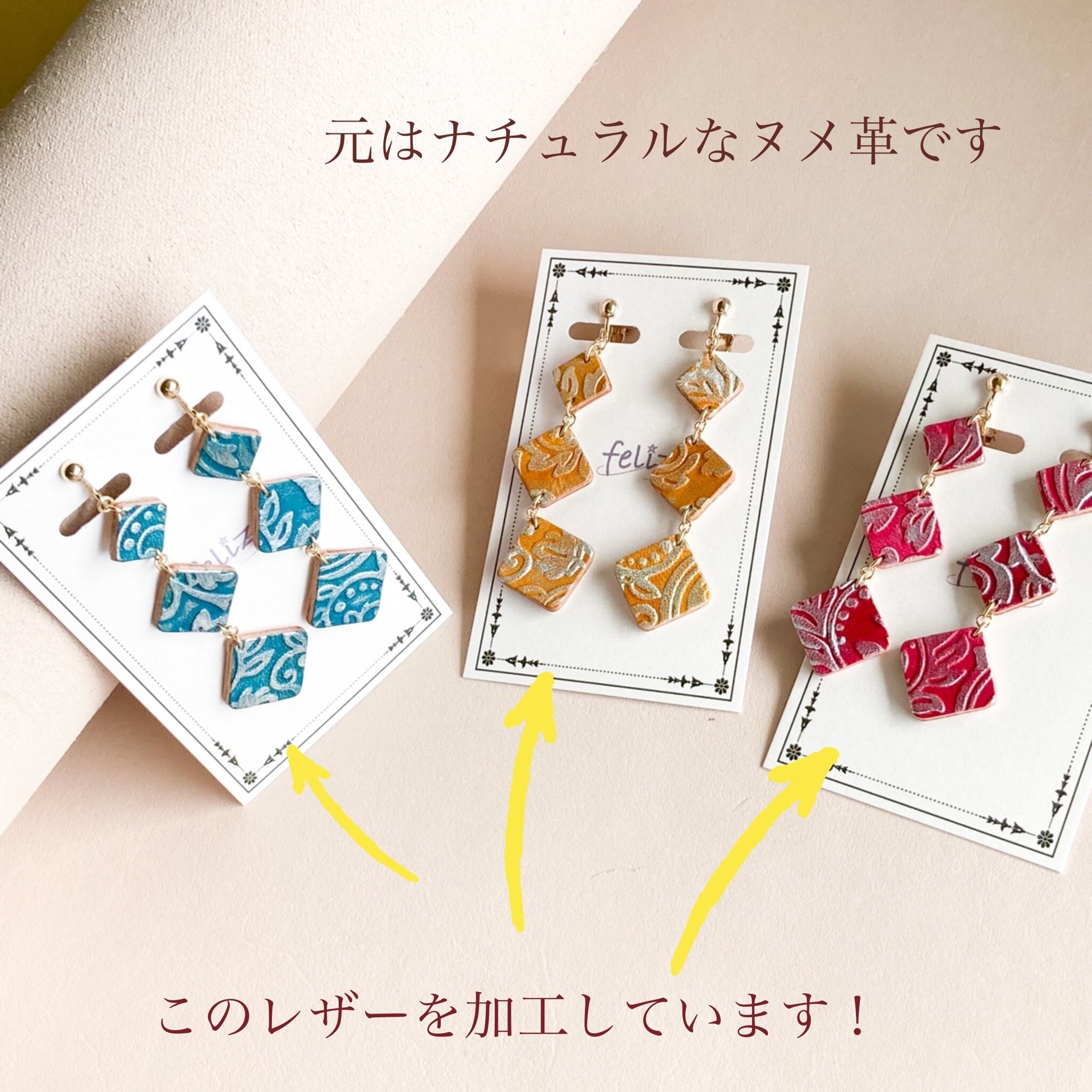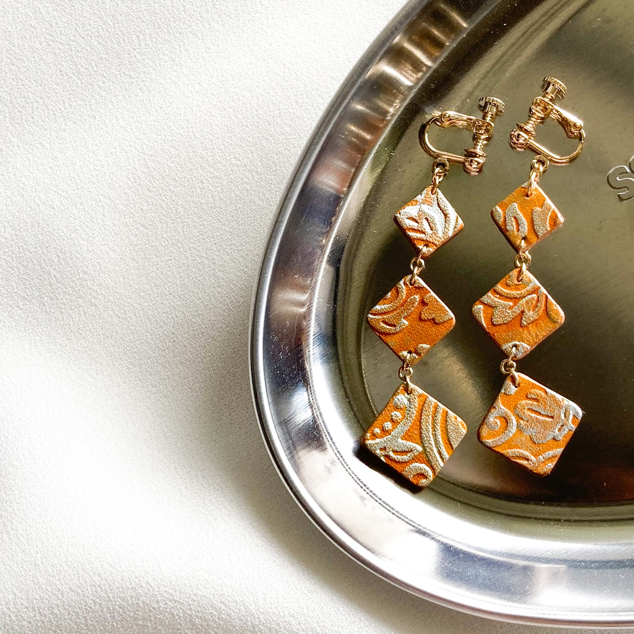 『香るアクセ/粋彩シリーズ』イエローのボタニカル柄レザーイヤリング/ピアスです。